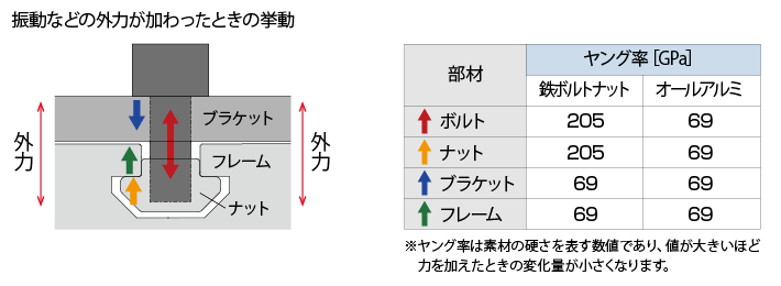 アルミのフレーム、ブラケットに対し、鉄ボルトの動きが小さくバランスが不安定